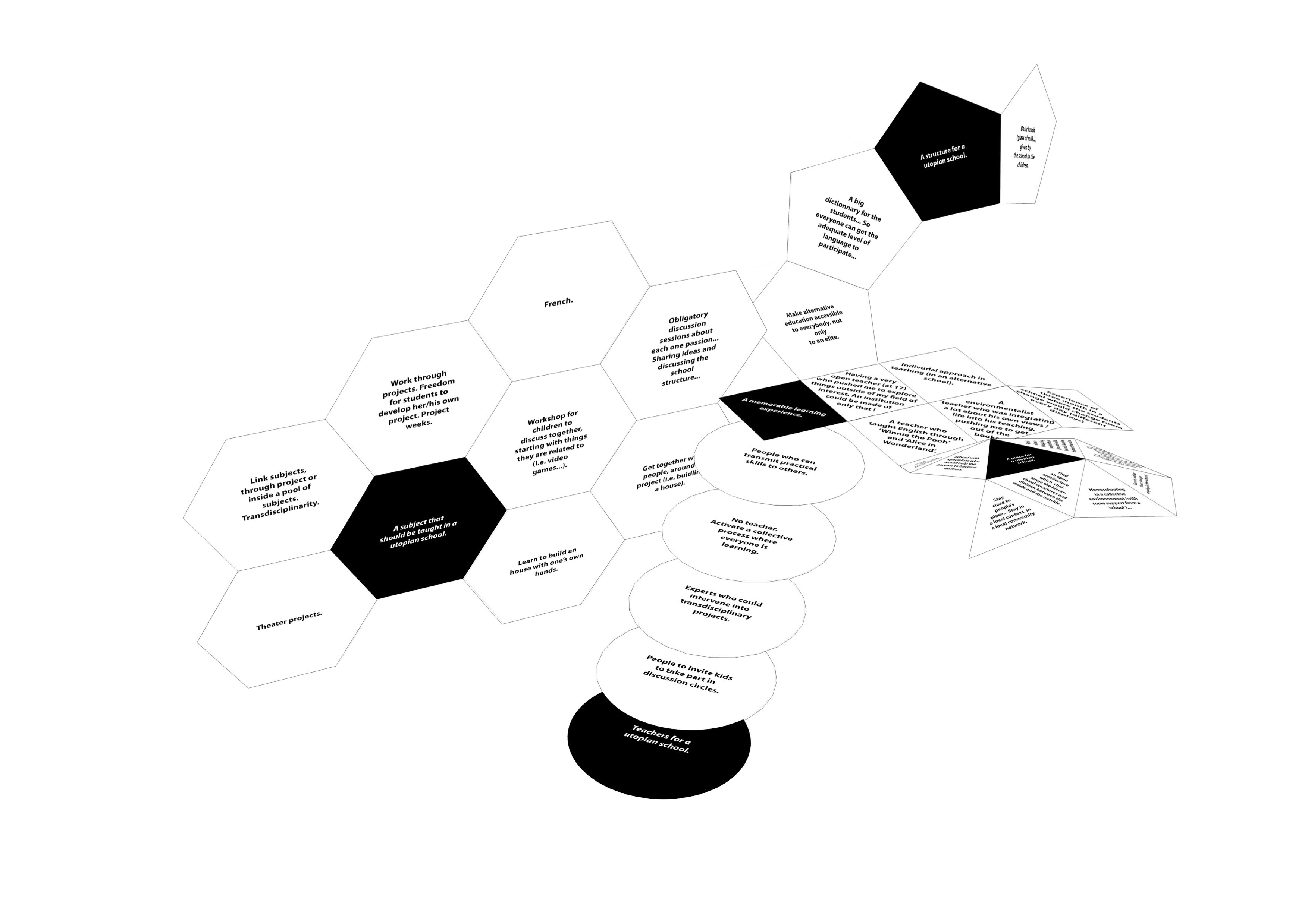 Nous avons recueilli les réponses et les suggestions de près de cinquante personnes au cours de l'après-midi et avons organisé ce matériel sur des formes géométriques, chacune représentant l'une des questions. Nous avons ensuite assemblé ces éléments, les utilisant comme des briques pour l'école. Les modules que nous avons utilisés font également référence à la structure modulaire de la Parade et sont un clin d'œil au concept de révolution moléculaire de Félix Guattari.