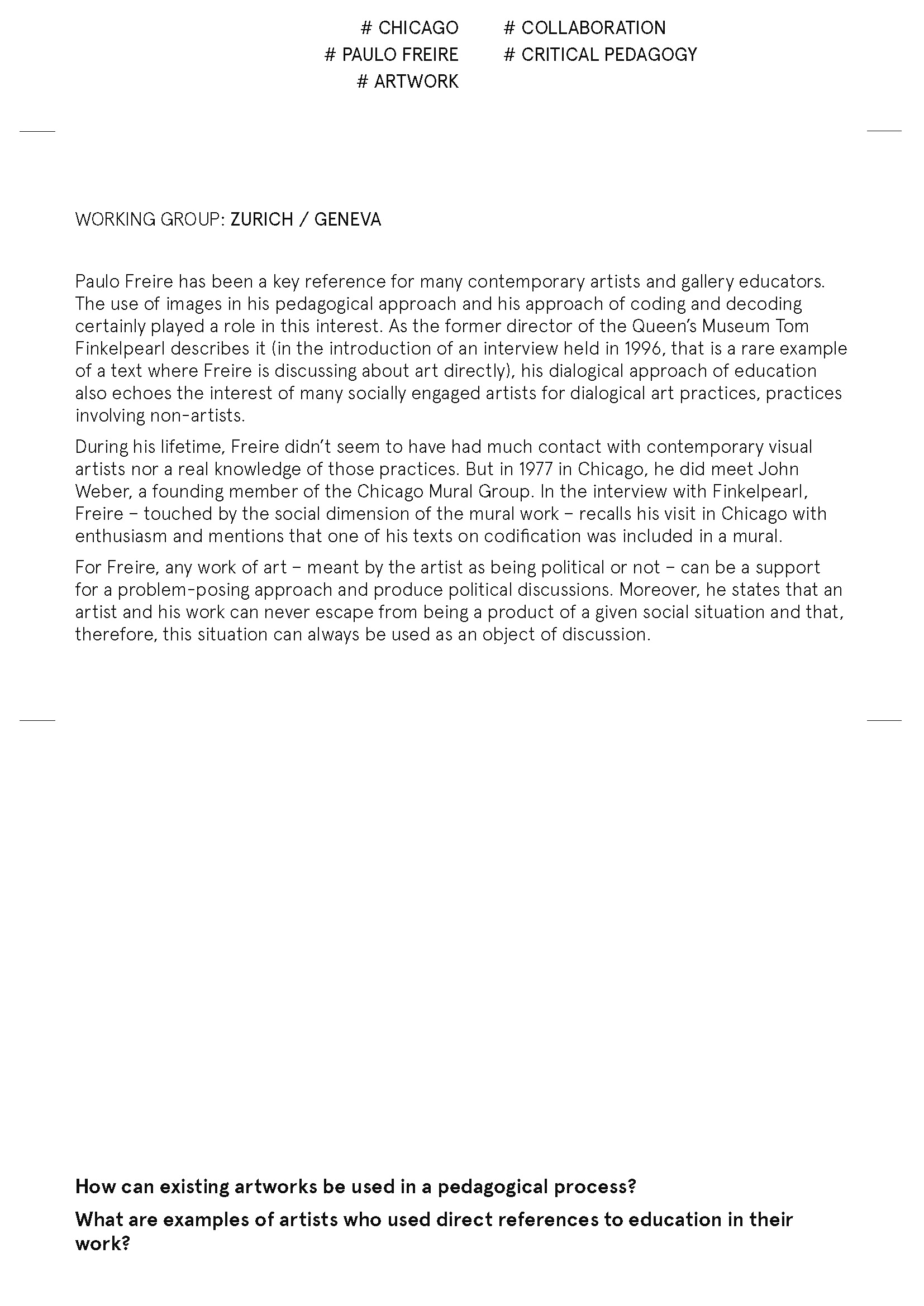 The Un/Chrono/Logical Timeline is an educational tool developed by intertwining hi/stories to engage with arts education histories and their global connections. The timeline includes a set of un-foldable cards and an instruction of use. When activated, it encourages participants to look for new ways of representing history of arts education taking into account a range of geopolitical viewpoints. Instead of organizing history in a customary chronological order, the timeline attempts to create connections between often seemingly remote (both in terms of time and geographical location) events, figures, publications, artefacts, etc. It invites to learn, construct, deconstruct, criticize and question history in a participatory way. (source : https://www.another-roadmap.net/clusters/intertwining-histories/tools-for-education-intertwining-histories/un-chrono-logical-timeline-en-es-fr-2/)