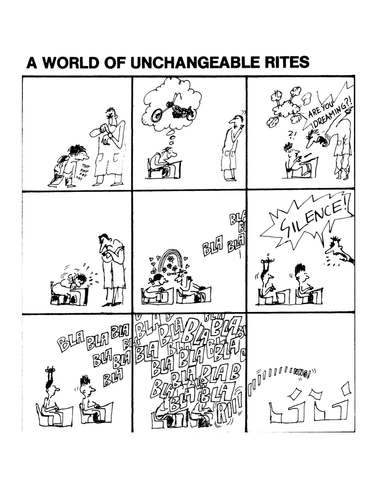 À l’heure des crédits ECTS et du «marché de l’éducation», les réflexions sur la pédagogie bancaire sont d’une grande actualité, et Freire a été durant ces dernières années une référence centrale pour de nombreux artistes 10 , notamment autour de l’Educational Turn 11 , in e-Flux Journal, no 0, novembre 2009, http://www.e-flux. com/journal/turning/.]. À cette actualité s’ajoute pour nous une pertinence géographique, car Freire a vécu dix ans à Genève dans les années 1970 et y a développé une large partie de sa pensée 12 . Dans Pedagogy of Autonomy, Reliving Pedagogy of the Oppressed, il évoque différentes anecdotes de sa vie en Suisse et raconte notamment comment le fils d’un de ses amis brésiliens, Claudius Ceccon (un dessinateur lui aussi en exil à Genève pour des raisons politiques), a vécu avec violence un enseignement du dessin basé sur la copie.