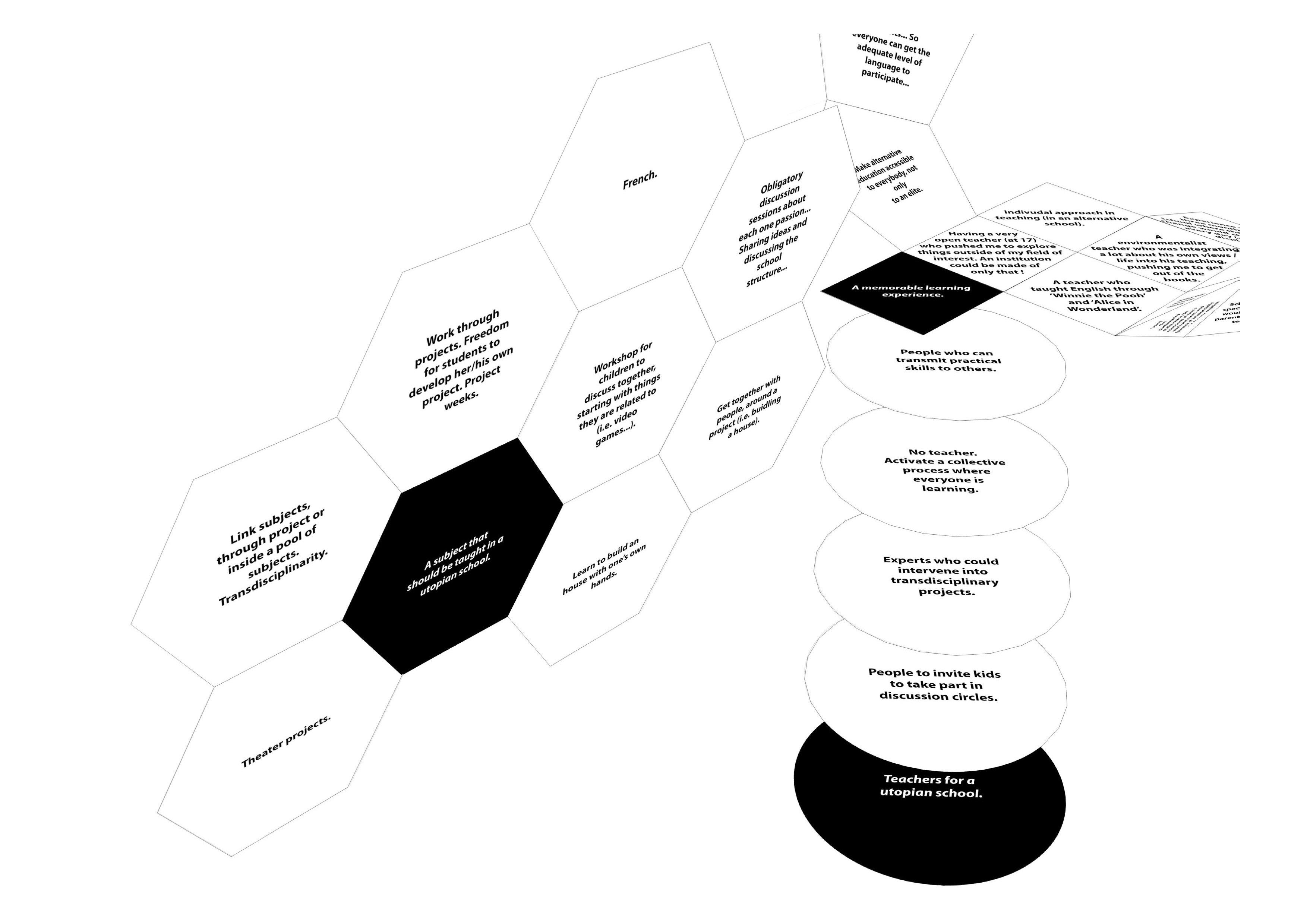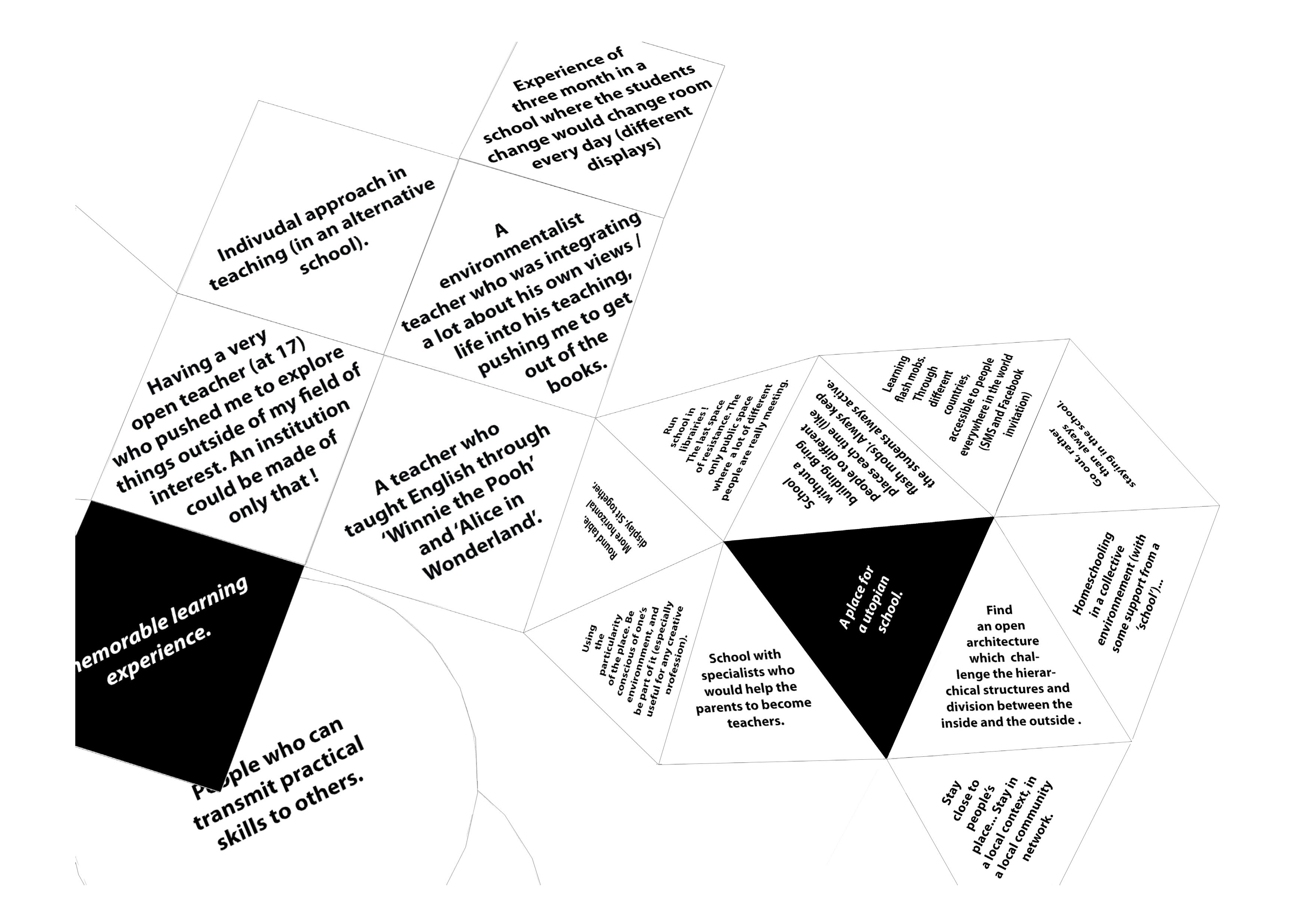 Nous avons recueilli les réponses et les suggestions de près de cinquante personnes au cours de l'après-midi et avons organisé ce matériel sur des formes géométriques, chacune représentant l'une des questions. Nous avons ensuite assemblé ces éléments, les utilisant comme des briques pour l'école. Les modules que nous avons utilisés font également référence à la structure modulaire de la Parade et sont un clin d'œil au concept de révolution moléculaire de Félix Guattari.