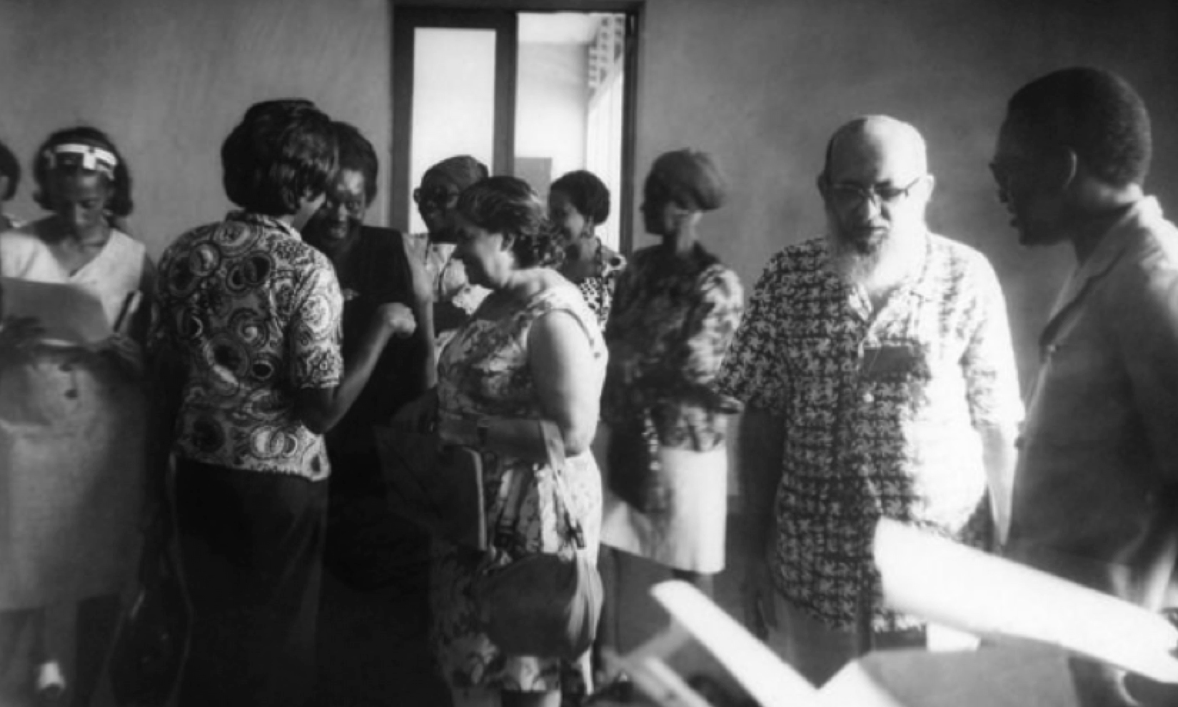Après son expérience d’enseignement à Harvard (où il voulait « voir la bête de plus près » (Instituto Paulo Freire, 2012, pp. 56-57)), Freire arrive avec sa famille à Genève, où il accepte un poste au Bureau de l’éducation, nouvellement créé par le Conseil œcuménique des Églises. Il voit dans cette situation professionnelle l’opportunité de ne pas être coupé du terrain (comme il l’aurait été en travaillant dans un contexte strictement universitaire). Surtout, il espère, depuis Genève, pouvoir s’impliquer concrètement dans les luttes d’indépendance des anciennes colonies africaines, en profitant du soutien de l’organisation (Gerhardt, 1993, p. 447). Il imagine pouvoir développer des actions pédagogiques d’envergure qui puissent jouer un réel rôle politique. Ainsi, dans une lettre qu’il rédige après sa prise de fonction, il écrit, en citant Fanon (Simpfendörfer, 1989, p. 153) :