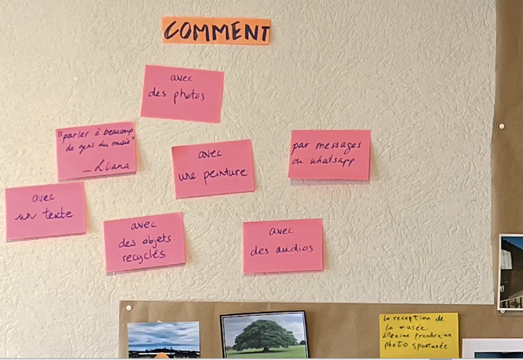 3- Augmenter le journal de bord mural au fil des activités sollicitant l’expression libre des participanxtes, en utilisant des images ou des transcriptions des discussions (ou autres formes textuelles). Chaque ajout contient des éléments qui peuvent faciliter la recherche des thèmes générateurs.