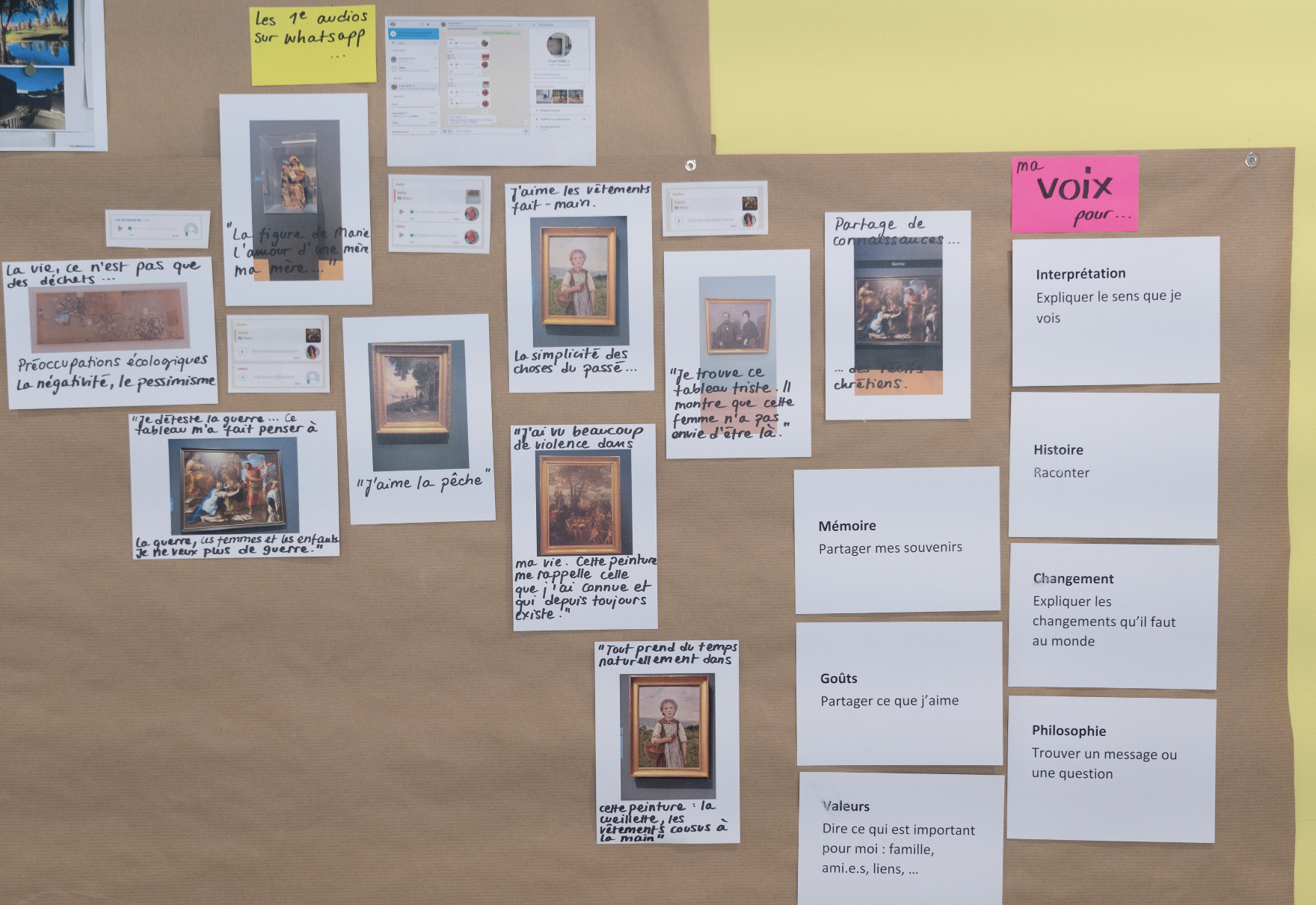 Dans le cas du volet de la recherche menée à Lausanne (MCBA - Ostara), le travail de visualisation a non seulement accompagné le dialogue entre les participantes et avec les médiatrices, mais a également facilité la production finale commune. Cette visualisation a pris la forme d’un journal de bord mural, un objet de travail évolutif, un témoin des directions possibles de la collaboration et un outil précieux de travail réflexif sur le projet.