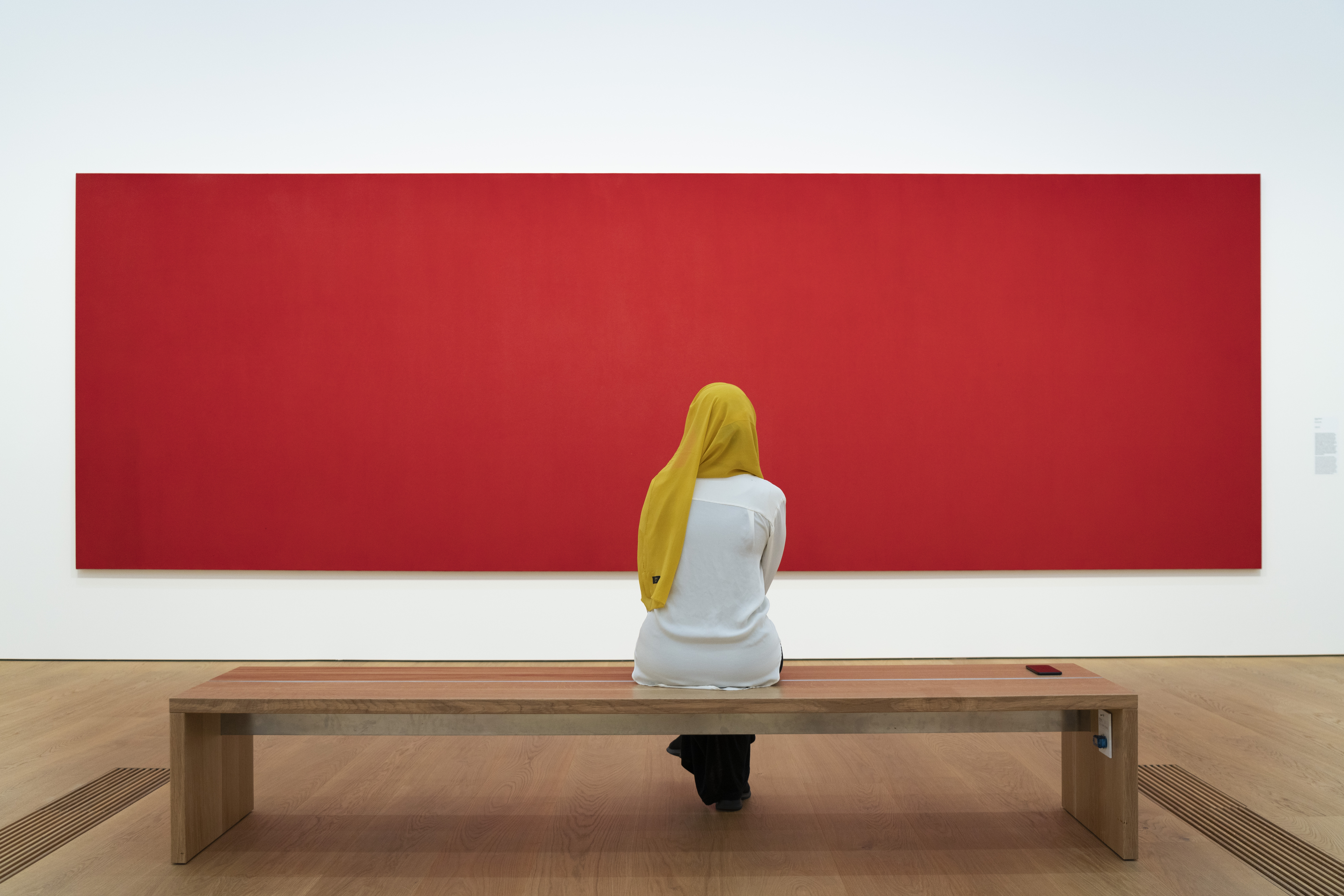 Hafsa commente en somali « Sans titre » d’Olivier Mosset (1982). Elle décrit ce que cette œuvre est aujourd’hui pour elle. Une relation qu’elle ne peut expliquer est née avec ce monochrome grand, propre, merveilleux et calme. Elle y trouve du repos et y voit apparaître des souvenirs. Pour parler de l’effet ressenti le jour où elle a découvert le tableau, c’est le mot obsession qu’elle utilise.